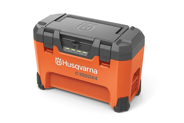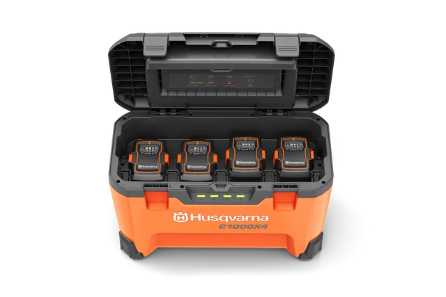 Husqvarna 40-1000X4 multi-bay battery charger for charging anywhere you want – in the workshop, at the work site, in your car or trailer. The 40-C1000X4 enables simultaneous high-power charging of up to four Husqvarna BLi-X 36V batteries in one unit, and thanks to smart load balancing, all batteries will be charged fast and efficiently. Fulfils IPX4 classification for water resistance for use in all weather conditions. Charger, transport box and storage – the multi-bay chargers offer an all-in-one set-up for time-saving handling of batteries. Batteries are not included.
