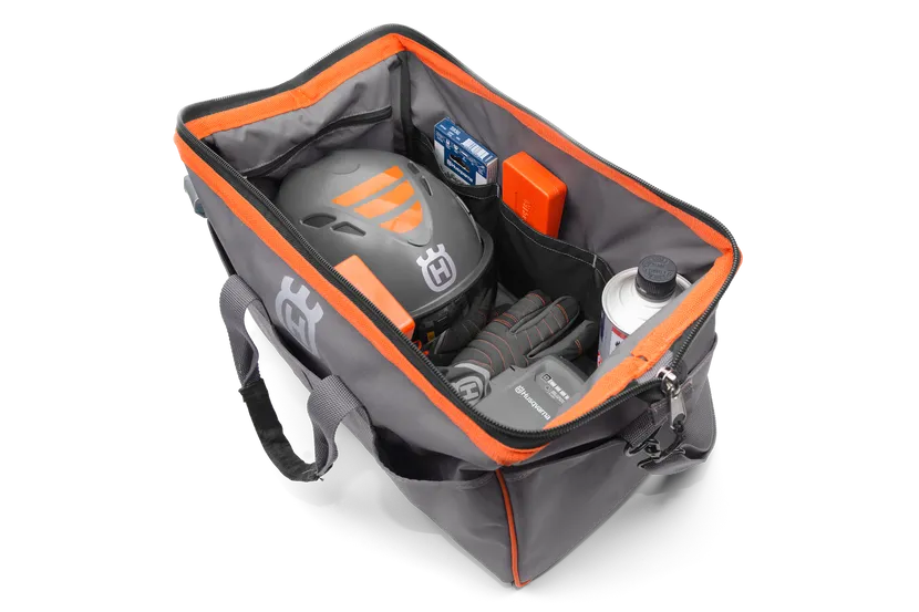 Top-quality Husqvarna tool bag that’s versatile enough for a variety of gear and accessories. Arborists, forestry pros, landscapers and even homeowners can hold and organize numerous tools with this heavy-duty bag that’s 600D coated and water resistant. The bag includes helpful features like a large-toothed zipper for easy access, a padded shoulder strap and comfortable handles, conveniently placed pockets, and both interior and exterior webbing reinforcement. Features high-visibility silk screened branding so you can show your Husqvarna pride wherever your work takes you.